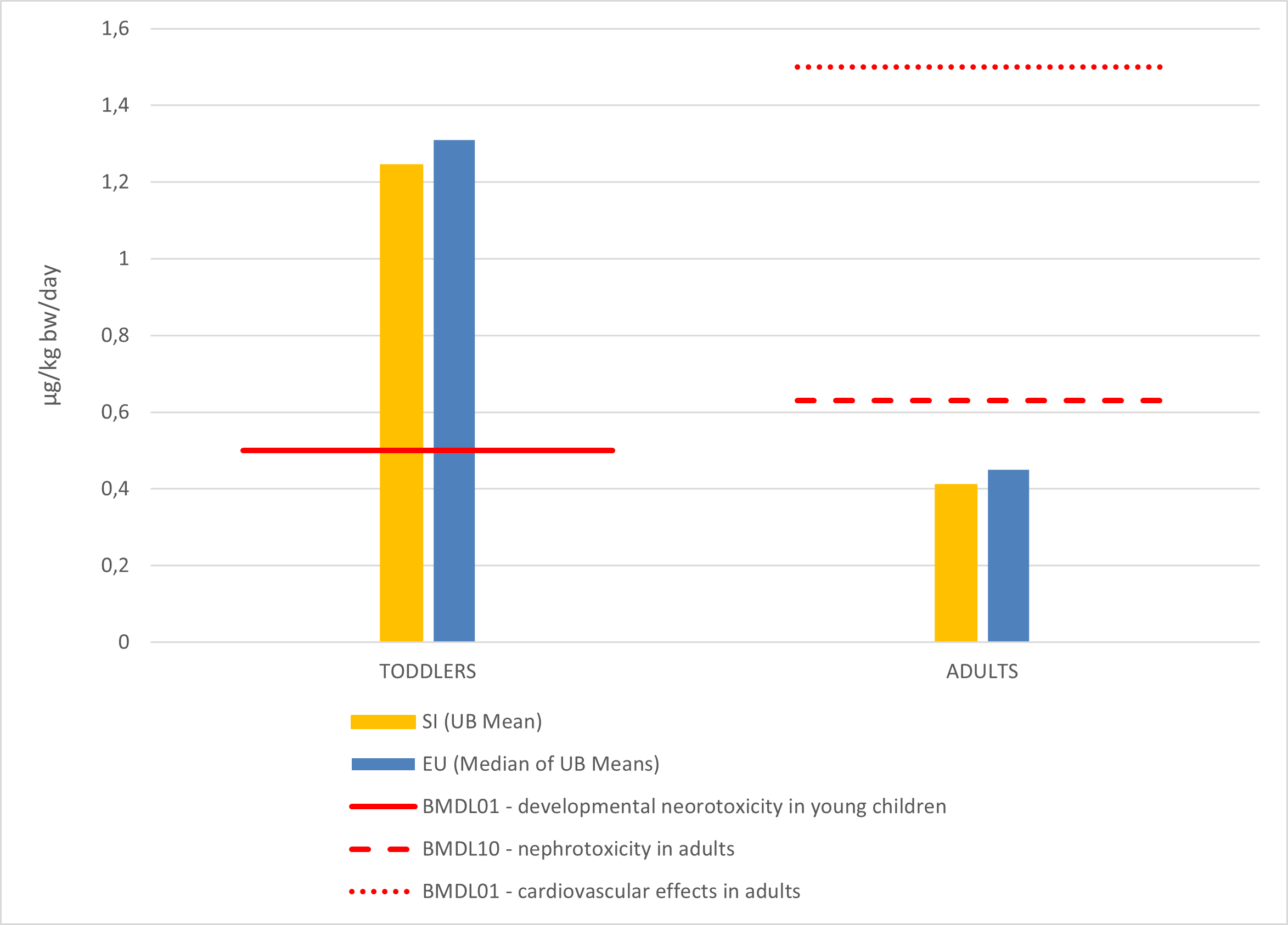 Slovenia[µg/kg bw/day] EU[µg/kg bw/day] BMDL01 - developmental neorotoxicity in young children[µg/kg bw/day] BMDL10 - nephrotoxicity in adults[µg/kg bw/day] BMDL01 - cardiovascular effects in adults[µg/kg bw/day]