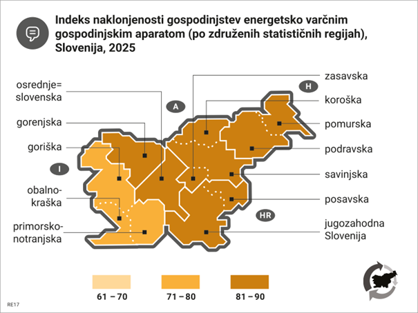 Slika RE17-6: Indeks naklonjenosti gospodinjstev energetsko varčnim gospodinjskim aparatom, (po združenih statističnih regijah), Slovenija, 2025
