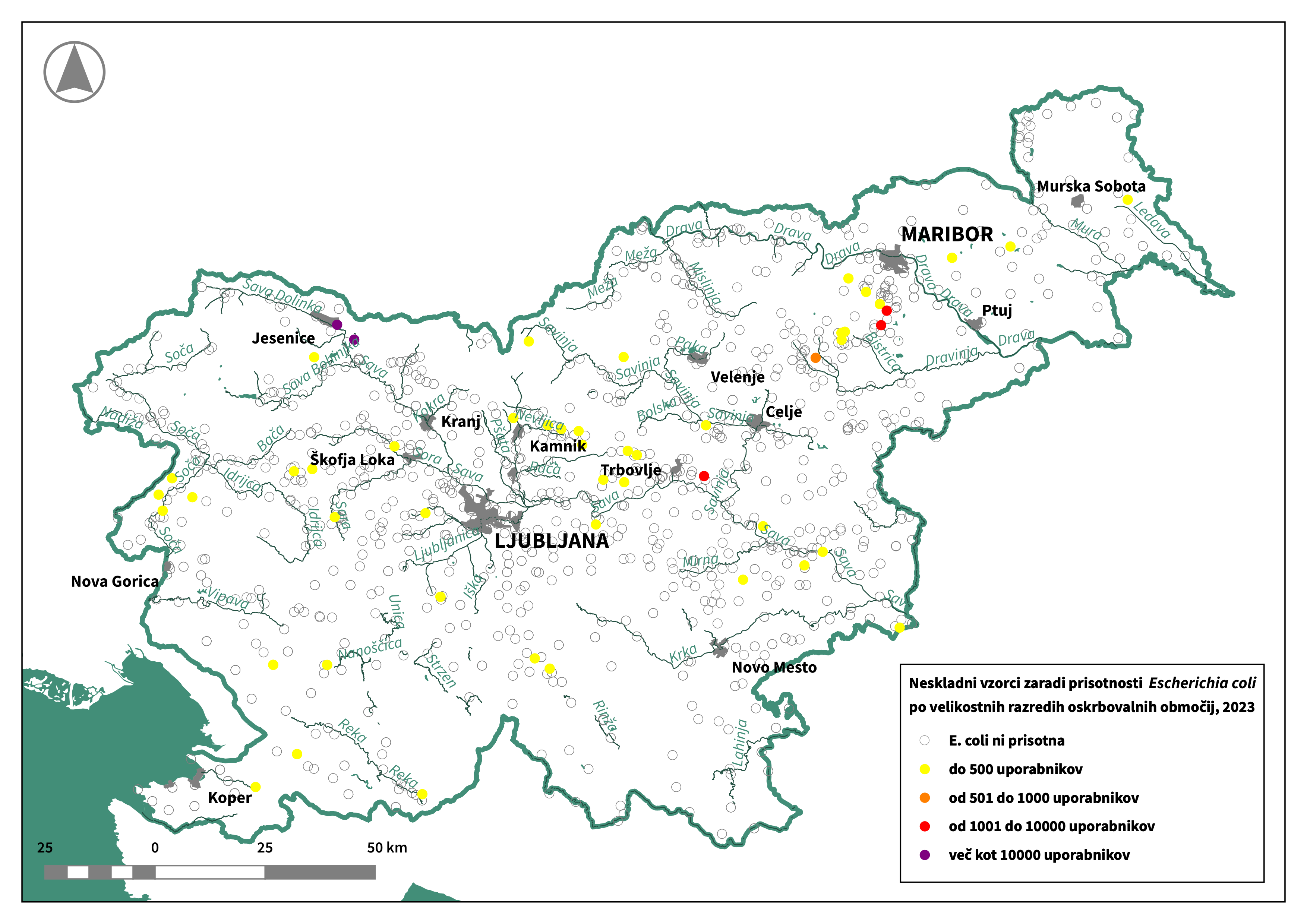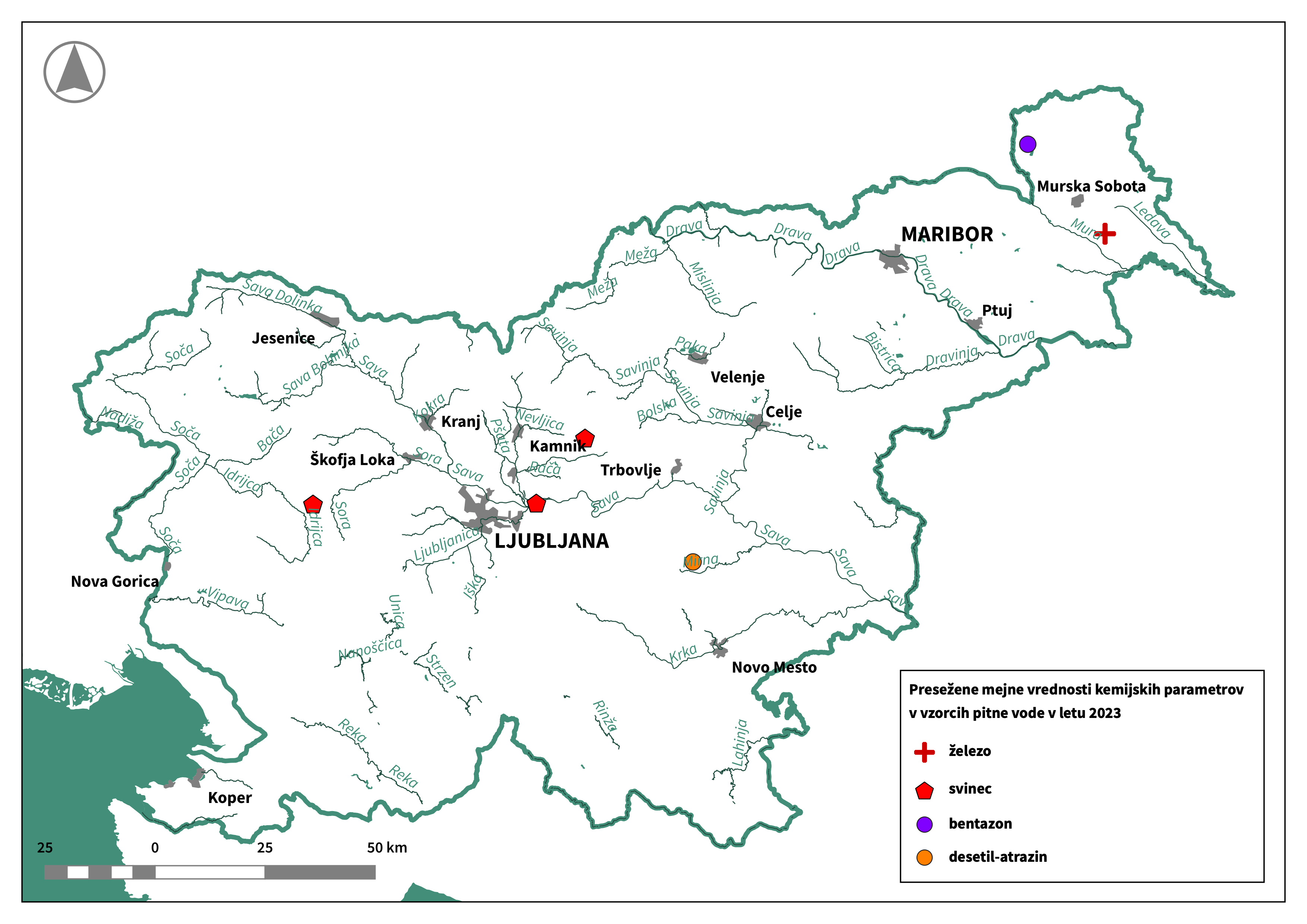 Zbirka podatkov o sistemih za oskrbo s pitno vodo in o skladnosti pitne vode za leto 2023. Nacionalni laboratorij za zdravje, okolje in hrano (NLZOH), 2024; podlage Agencija RS za okolje, GURS; Obdelava: Nacionalni inštitut za javno zdravje (NIJZ), 2024