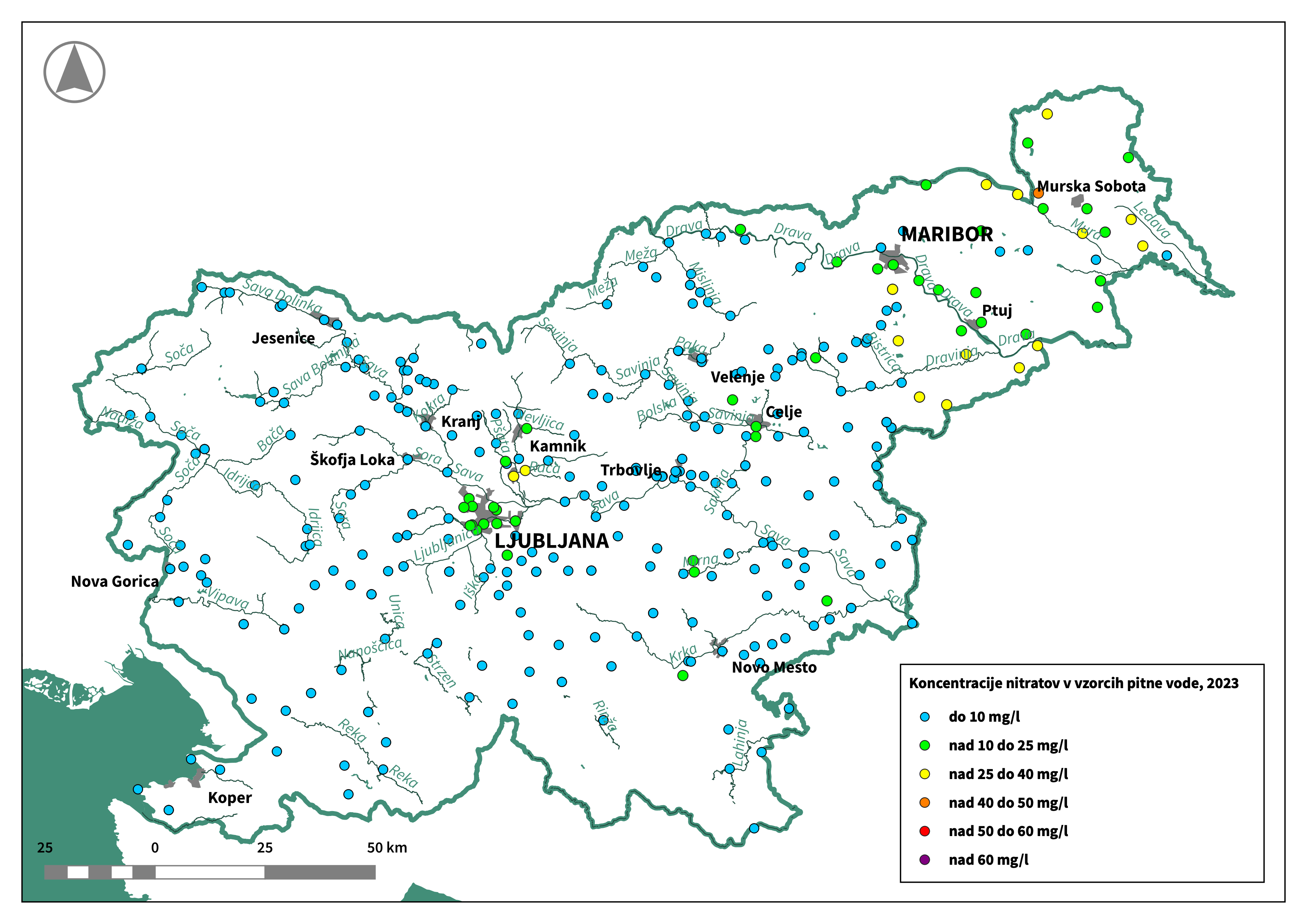 Slika VD08-7: Koncentracije nitratov v pitni vodi v letu 2023
