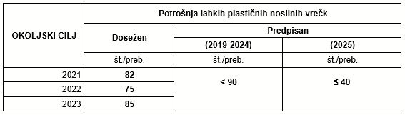 • do 31. decembra 2025 zmanjšati potrošnjo lahkih plastičnih nosilnih vrečk z debelino stene < 50 mikronov, tako da ta ne bo presegla 40 lahkih plastičnih nosilnih vrečk na osebo na leto oziroma do 31. decembra 2024 zmanjšati njihovo potrošnjo na manj kot 90 lahkih plastičnih nosilnih vrečk na osebo na leto,